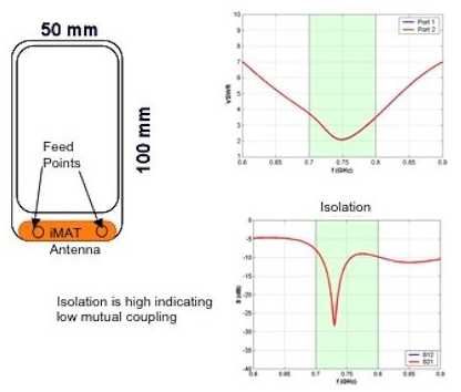 還有一種可行的解決方案,使用SkyCross公司提供的隔離模式天線技術(iMAT),從相同的天線結構產生兩種不同的模式。iMAT天線結構放置在手機的一端;兩個饋點分別運行不同的輻射模式。這兩個饋點是相互隔離的,不會發生互耦導致的損耗,因此每種模式的效率都很高。另外,輻射圖案是不同的,因此會產生一個較低的相關系數。圖4描述了iMAT天線的實現原理,從圖中可以看到,在相同天線結構上的兩個饋點之間的隔離。