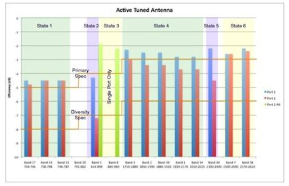 為了緩解各種使用模型的影響,有必要將狀態調諧和模式隔離兩種方法結合運用。模式隔離允許具有多個饋點的單天線結構執行多個MIMO天線的功能;而狀態調諧則允許這種結構非常小,但仍然能夠非常高效地在寬頻率范圍內工作。圖5顯示了以6個調諧狀態覆蓋多個頻段的可變狀態iMAT天線結構的平均測量效率。iMAT結構能在平衡或不平衡的增益配置下工作,并且與傳統天線設計技術相比,能以更小的封裝提供更高的性能。
