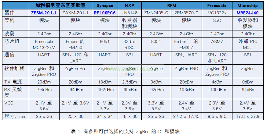 IC 和模塊中都提供有 ZigBee 解決方案(見表1)。 商業(yè)使用本規(guī)范不收取費(fèi)用 - 制造商必須屬于 ZigBee 聯(lián)盟,最終產(chǎn)品必須
