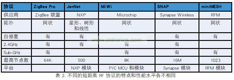 使用芯片制造商開發(fā)的專有協(xié)議可免去 ZigBee 許可證費(fèi)(見表 2)。 NXP 提供 JenNet 協(xié)議,該協(xié)議在 2.4GHz 波段內(nèi)運(yùn)行,能組建樹狀、星狀和線性自修復(fù)網(wǎng)絡(luò),最高包含500 個(gè)節(jié)點(diǎn)。 Microchip 的免費(fèi) MiWi 堆棧同時(shí)以 sub-GHz和 2.4GHz 兩種頻率,在 PIC 微控制器和 Microchip 收發(fā)器上運(yùn)行。