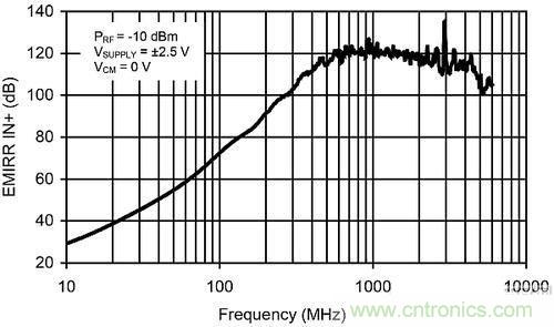 EMIRR曲線展示了運放被傳導的抗RF信號(該信號被應(yīng)用到非反相輸入端)干擾能力的測定值。術(shù)語“被傳導”是指該RF信號被直接應(yīng)用到使用阻抗匹配型印刷電路板(PCB)的運放輸入端。此外,還對放大器輸入端的反射進行了表征和說明。