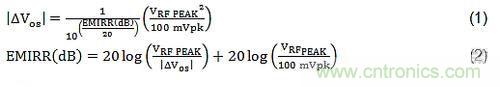 方程式(1)和(2)給出了EMIRR的數(shù)學定義。兩個方程式互為彼此的重置版本。方程式(1)展示了所用RF信號和偏移電壓的改變之間的關(guān)系。請注意所用RF信號的平方引起的偏移電壓變化。這意味著入射RF信號較小幅度的增加可導致偏移電壓的顯著增加。還請注意,術(shù)語EMIRR的作用是減弱RF信號的影響;換句話說,較大的EMIRR(dB)可使偏移電壓的變化大幅度減少。方程式(2)是在表征過程中用來計算EMIRR(dB)的方程形式。