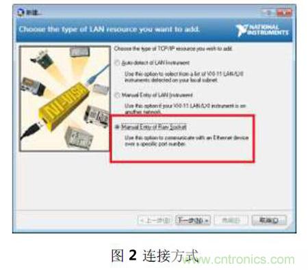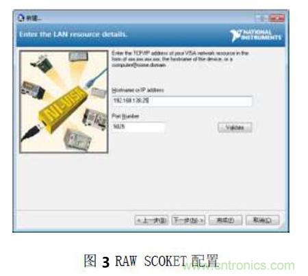 啟動Masurement & Automation Explorer 軟件,選擇設(shè)備和接口,在添加網(wǎng)絡(luò)設(shè)備中,使用Manual Entry of Raw Scoket(手動輸入原始SOCKET)方式連接,ZDS2024 示波器采用端口號5025 來接收SCPI 命令。如圖2和圖3所示。設(shè)置好后,可進(jìn)行測試,確保連接成功。