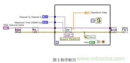 左邊的三個控制用于輸入設(shè)置,包括連接的VISA 資源名稱,獲取數(shù)據(jù)的通道,最大延遲時如何實(shí)現(xiàn)對示波器的遠(yuǎn)程控制間。右邊為結(jié)果波形顯示控件。設(shè)計(jì)好前面板以后,就可以進(jìn)入程序框圖設(shè)計(jì)了。在VI 的程序框圖中的Function 面板中,選擇“儀器I/O”可以找到有關(guān)ZDS2024 的驅(qū)動庫的模塊,可以在程序框圖中直接使用,設(shè)計(jì)結(jié)果如圖5所示。