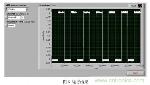 在程序框圖中,先初始化示波器,并啟動示波器的AutoSetup 功能,然后循環(huán)獲取示波器的數(shù)據(jù),并送顯示,直到用戶中止或者獲取數(shù)據(jù)過程中出現(xiàn)錯誤。最后可以在前面板啟動運(yùn)行,結(jié)果如圖6所示。