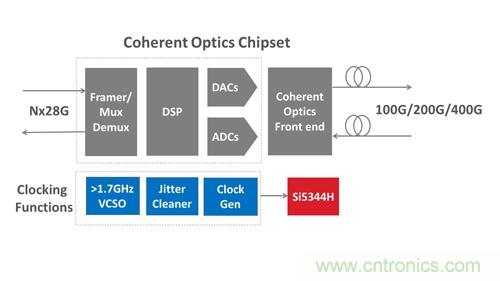 通信市場中最大增長驅動因素之一是業內城域網絡和數據中心互聯(DCI)領域從10G到100G的轉變。相干光學技術可用于100G和400G應用,因為它使得服務提供商能夠通過現有的光纖發送更多的數據,減少為帶寬擴展而進行網絡升級的成本和復雜性。當前用于相干光的定時解決方案在成本和尺寸方面還未達到最優化,需要VCSO、時鐘發生器和分立器件的多樣化組合。