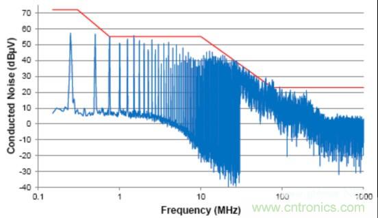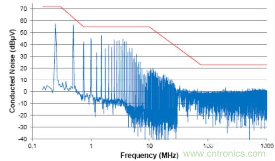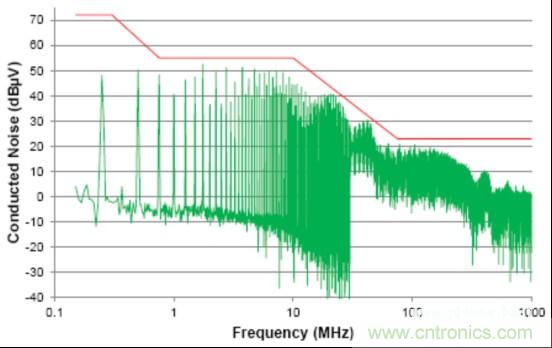由于信號的共模部分能夠與系統(或與外部系統)中的其它分量耦合在一起(通過輻射或傳導路徑),這個共模噪聲直接影響放射性能。這個器件的傳導放射按照工業電氣工程/電子 (IBEE) 茨維考技術的工程服務進行測量;如圖2中所示,這個器件的傳導放射連同一個普通汽車原始設備制造商(OEM)限值線一同繪制。