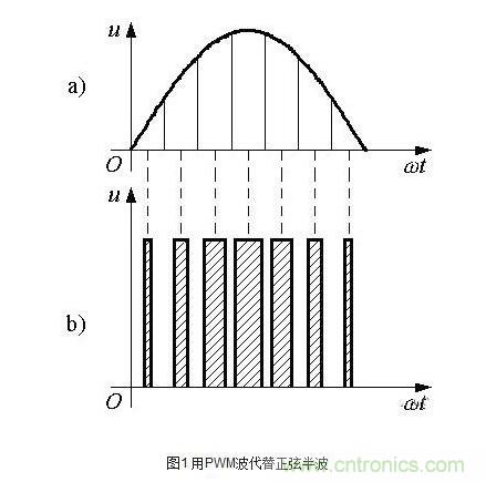 如圖1 所示,用一系列等幅不等寬的脈沖來代替一個正弦半波,正弦半波N 等分,看成N 個相連的脈沖序列,寬度相等,但幅值不等;用矩形脈沖代替,等幅,不等寬,中點重合,面積(沖量)相等,寬度按正弦規(guī)律變化。