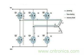 標(biāo)準(zhǔn)的三相功率級(power stage)被用來驅(qū)動一個三相無刷直流電機,如圖1所示。功率級產(chǎn)生一個電場,為了使電機很好地工作,這個電場必須保持與轉(zhuǎn)子磁場之間的角度接近90°。六步序列控制產(chǎn)生6個定子磁場向量,這些向量必須在一個指定的轉(zhuǎn)子位置下改變。霍爾效應(yīng)傳感器掃描轉(zhuǎn)子的位置。為了向轉(zhuǎn)子提供6個步進電流,功率級利用6個可以按不同的特定序列切換的功率MOSFET。下面解釋一個常用的切換模式,可提供6個步進電流。
