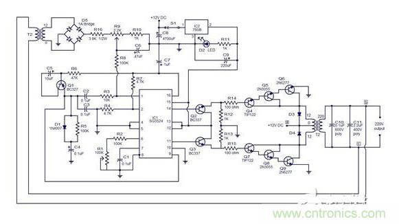 因此誘導(dǎo)變壓器二次電壓(由于電磁感應(yīng)),這個電壓220V輸出波形的上半周期。在此期間,11腳低,其成功的階段將處于非活動狀態(tài)。當(dāng)IC引腳11云高的第三季度結(jié)果Q7的獲取和交換,Q8和Q9將被打開。從+12 V電源通過變壓器的初級下半部和匯到地面通過晶體管的Q7,Q8,Q9,以及由此產(chǎn)生的電壓,在T2次級誘導(dǎo)有助于的下半部周期(標(biāo)簽上標(biāo)明)電流流220V輸出波形。