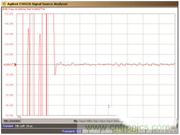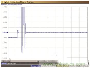 現在,我們來檢查一下,從 3.98GHz到 4.00GHz階躍 20MHz 之后,LTC6946 的輸出穩定到與最終頻率值相差 10kHz 以內有多快。E5052A 可捕捉瞬態響應,如圖 3 所示。