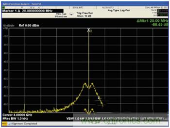 圖5:LTC6946 的輸出頻譜,在 4GHz 輸出、環路帶寬為 2MHz 時展示了不同尋常的低雜散噪聲