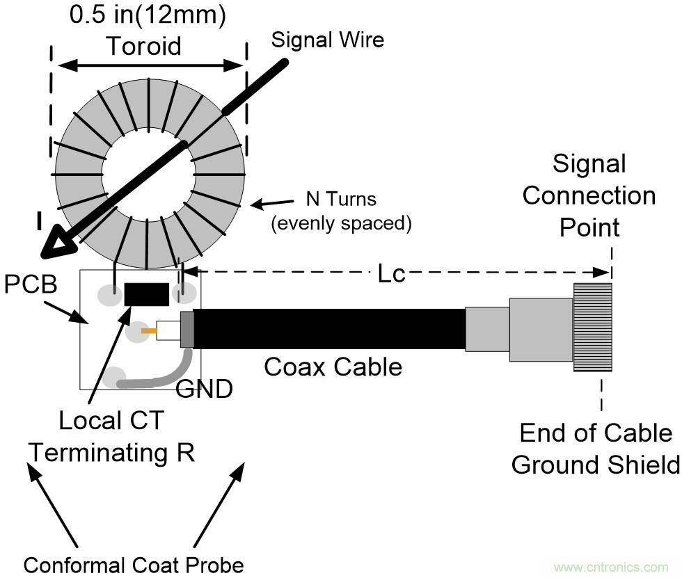 圖2所示的電流探頭使用SMD電阻,這就是為什么需要一個小PCB來安裝它并固定到同軸電纜的末端。務必保形涂覆整個電流互感器組件;繞組非常脆弱,同軸電纜會給電流探頭帶來很大的機械應力。
