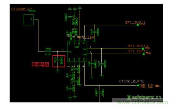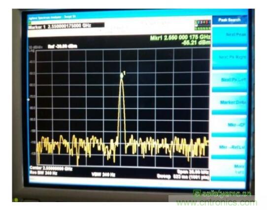 從測試結(jié)果來看,諧波超標(biāo)很嚴(yán)重,這一點與天線區(qū)域的雜訊信號很相似,考慮到傳導(dǎo)嫌疑已經(jīng)排除,因此分析的重點集中到了天線區(qū)域的非線性器件。從如圖4所示原理圖可以看出,天線的調(diào)諧開關(guān)是正常工作的,由于天線開關(guān)本身是非線性器件,因此首先確認(rèn)天線開關(guān)的影響。將天線開關(guān)旁路(天線仍然正常)如圖5所示,發(fā)現(xiàn)此時2.55GHz的雜訊可以降低到-55.7dBm左右,因此可以確定天線區(qū)域的雜訊就是調(diào)諧開關(guān)造成的。