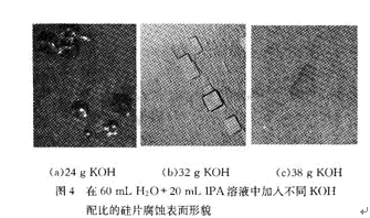 四棱錐和四棱臺的四個斜面對應于腐蝕速率最低的(111)系列晶面。當濃度較低時,(100)和(111)晶面的腐蝕速率比小,所以出現小丘;當濃度增大時,(100)和(111)晶面的腐蝕速率比增大,所以出現小坑;濃度達到一定程度后,(100)和(111)晶面的腐蝕速率比趨于穩定,依然出坑,而(110)和(111)晶面的腐蝕速率比增大,從而產生斜坡。只有調整KOH的濃度,得到匹配的(100)、(110)、(111)晶面的腐蝕速率,才能獲得較好的腐蝕表面。試驗還表明,溫度主要影響腐蝕速率,對硅片腐蝕形貌影響不大。