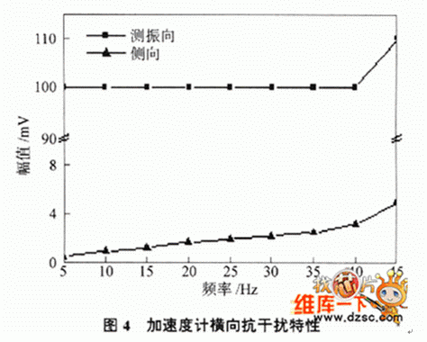 對單自由度的低頻光纖光柵加速度計來說,橫向抗干擾特性也是一項重要指標.實驗在加速度計的測振方向以及與其垂直的側向分別加0.5g的加速度,在5~45 Hz的頻帶范圍內對兩個方向的振動值進行了對比,測量結果如圖4所示.從圖中可以看出,在加速度計的測振方向激振時加速度計測量輸出維持在100 mV 附近,而在與測振垂直方向激振時輸出在1~4mV范圍內,其橫向抗干擾能力達40 dB.可見此種設計方案可以有效降低橫向干擾的影響.