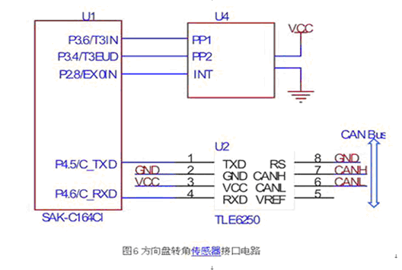 C164CI與方向盤(pán)轉(zhuǎn)角傳感器的接口電路如圖6所示。片內(nèi)內(nèi)置增量編碼的正交解碼器,該解碼器使用定時(shí)器3的兩個(gè)引腳(T3IN、T3EUD)作為正交脈沖的輸入,在正確設(shè)置相關(guān)寄存器后,定時(shí)器3的數(shù)據(jù)寄存器的值與方向盤(pán)轉(zhuǎn)角成正比,故可方便的計(jì)算轉(zhuǎn)角,本文所使用的方向盤(pán)轉(zhuǎn)角傳感器每一圈對(duì)應(yīng)44個(gè)脈沖,設(shè)定時(shí)器3的數(shù)據(jù)寄存器為T(mén)3,則絕對(duì)轉(zhuǎn)角為。