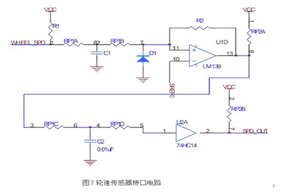 根據(jù)前面部分介紹的輪速傳感器信號(hào)特點(diǎn),設(shè)計(jì)接口電路如圖7所示。
