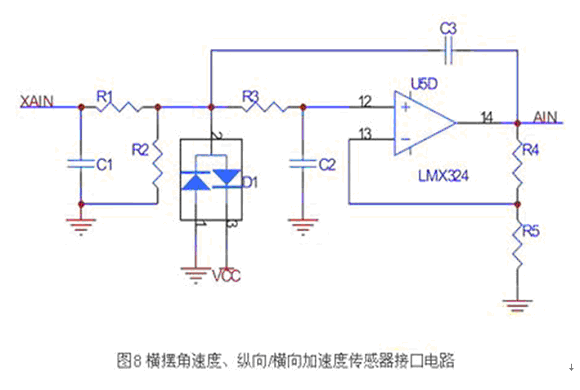 橫擺角速度、縱向/橫向加速度傳感器的安裝位置基本相同,輸出都是0V-5V的模擬量,由于汽車(chē)顛簸造成的信號(hào)波動(dòng)特性一致,故封裝在同一模塊中。其硬件接口如圖8所示,實(shí)現(xiàn)硬件模擬前置濾波,以抑制來(lái)自傳感器的模擬信號(hào)中的高頻噪聲成分,防止在采樣過(guò)程中出現(xiàn)混疊現(xiàn)象。運(yùn)放使用滿擺幅輸出的LMX324。