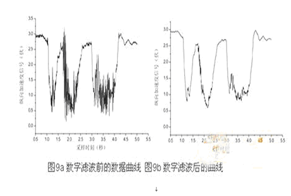 調(diào)整圖8中各個(gè)阻容元件的參數(shù),即可設(shè)置濾波截止頻率和延時(shí)大小。汽車(chē)運(yùn)行過(guò)程中,在較好路面上行駛時(shí),由于信號(hào)較好,延時(shí)盡量要小,而在顛簸路面上行駛,則希望濾波效果要好。但是由于硬件濾波的頻率特性一經(jīng)設(shè)計(jì)完畢,無(wú)法實(shí)時(shí)修改,故需要在軟件中設(shè)計(jì)數(shù)字濾波環(huán)節(jié)。數(shù)字濾波常用的有維納濾波器、卡爾曼濾波器、線性預(yù)測(cè)器、自適用濾波器等。在這里選用計(jì)算量小、實(shí)時(shí)性能好的一階低通濾波。