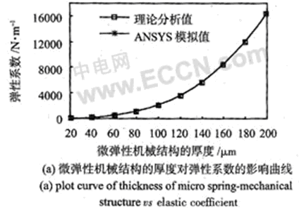 為驗證理論的正確性,同時,用有限元模擬工具AN-SYS對彈性臂進行數(shù)值模擬,各參數(shù)取值為:F=1 ×10-4N,E=1.69×1011N/m2,G=7.26 ×1010N/m2,l1=2600μm,l2=400μm,b=200 μm,h=200μm,可得到單個彈性臂在A點受到集中力F的作用下的位移為0 0244μm。因此,彈性系數(shù)數(shù)值模擬值k=4 × 10-4/2.44×10-8=1.64×104(N/m),而由式(5)代入上述參數(shù)可得理論分析值k=1.63 ×104N/m,兩者相對誤差為0.6%。