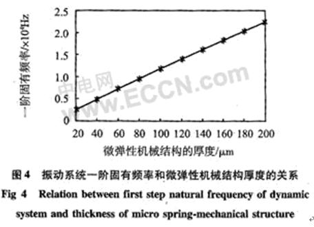 ,m為微結(jié)構(gòu)的當量質(zhì)量,這里面含有每個彈性臂簡化到A點的等效質(zhì)量,鑒于等效質(zhì)量求出來誤差較大,僅用有限元模擬工具ANSYS對振動系統(tǒng)進行模態(tài)分析。模擬中,取硅的密度為ρ=2330 kg/m3,l3=l4=2000μm參數(shù)含義如圖2所示,其余取上述給定的數(shù)值,則振動系統(tǒng)的一階固有頻率為22.37 kHz,在垂直于微結(jié)構(gòu)平面的方向上振動。同時,模擬出了彈性臂寬度b=200μm時,一階固有頻率f和微結(jié)構(gòu)厚度h的關(guān)系圖如圖4所示??梢娬駝酉到y(tǒng)的一階固有頻率和微結(jié)構(gòu)的厚度h近似地保持線性的關(guān)系。