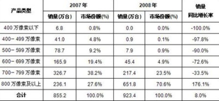 由于技術(shù)不斷升級,2008年數(shù)碼相機(jī)的像素進(jìn)一步升級。雖然數(shù)碼相機(jī)總體市場保持了較為溫和的增長,但是不同像素類型的數(shù)碼相機(jī)增長幅度不盡相同。其中,800萬像素以上的數(shù)碼相機(jī)同比2007年有176.1%的增長;而800萬像素以下的所有數(shù)碼相機(jī)產(chǎn)品都出現(xiàn)了不同程度的下滑。其中400萬像素以下的數(shù)碼相機(jī)則完全退出市場。