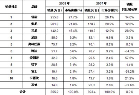 2008年,佳能進(jìn)一步保持并鞏固其銷售量市場第一的領(lǐng)先地位,市場占比達(dá)到27.7%,Sony繼續(xù)保持中國數(shù)碼相機(jī)市場的第二名的位置,在其突出的產(chǎn)品攻勢下,市場份額有所上升。三星、尼康和奧林巴斯,分別進(jìn)入中國數(shù)碼相機(jī)市場的前五名。
