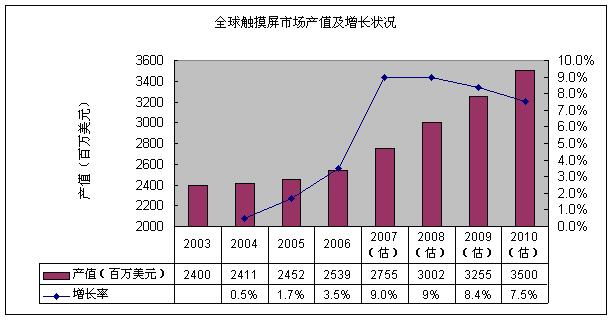 圖1 全球觸摸屏市場(chǎng)產(chǎn)值及增長(zhǎng)狀況