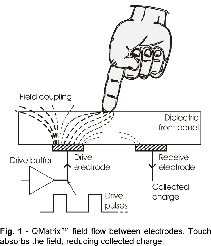 利用多條 X 驅動和 Y 接收線并將按鍵電極設置到交叉點上構成的多鍵矩陣,鍵盤按鍵會如機電鍵盤般按時順序掃描。QMatrix 電極可以感測任何介電材料,如厚度高達 50mm 的玻璃或塑料,取決于電極的大小和脈沖串長度 (增益) 的設置。
