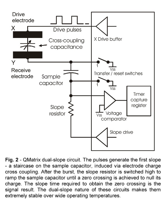 QMatrix器件采用一個掃描式的橫向電極無源矩陣,實現了使用單芯片驅動的大量觸摸按鍵。這種構造可提高感測芯片的引腳利用效率,較之于每個按鍵都需要一個感測連接 (如 Qtouch™ 及許多同類器件),芯片和按鍵矩陣之間所需的連接數量較少。QMatrix 器件所需的部件最少,最大限度地降低了單個按鍵的成本。在量產時,此器件可以令芯片成本降至每按鍵 0.05 美元。此外,這種構造本身就具有抵抗環境變化、水膜影響以及無線電干擾的特性。