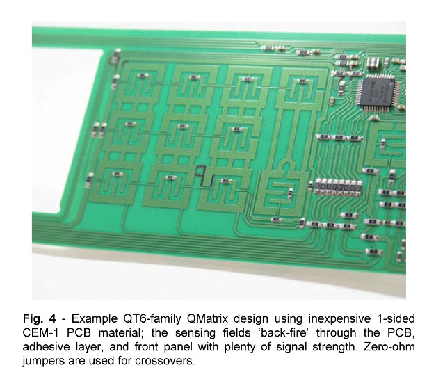 圖4:QT6 系列 QMatrix 設計示例。設計采用廉價的單面 CEM-1 PCB 材料,感測電場背對穿過 PCB 、膠層和前面板,其信號強度集中在前面板方向上,使用0 歐姆的跳線器作為交叉。[page]