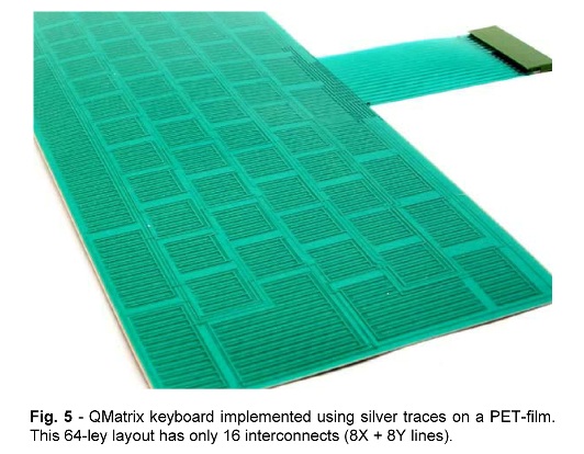 圖5: 利用 PET 薄膜上的銀線來實現的 QMatrix 鍵盤,這個 64 鍵布局只需要 16 個互聯 (8X + 8Y線)。