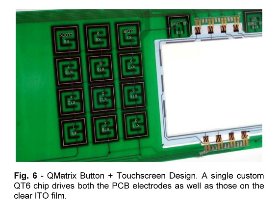 圖6:QMatrix 按鍵和觸摸屏的一體式設計,利用一片 QT6 單芯片同時驅動 PCB 電極以及 ITO 薄膜上的鍵盤。