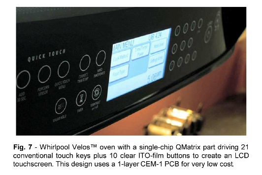 圖7:Whirlpool Velos 微波爐采用單芯片 QMatrix 來驅動 21 個傳統的觸摸按鍵,以及構成 LCD 觸摸屏的 10 個透明式 ITO 薄膜式按鍵。該設計采用了單層 CEM-1 PCB,成本很低。