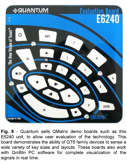 圖8 :量研科技銷售 QMatrix 演示版如 E6240,為用戶提供該技術的評測手段。該評測板可以支持各種按鍵尺寸和布局,演示 QT6 系列器件的強大功能。QMatrix 演示版還可配合 QmBtn 軟件使用,以進行按鍵實時信號的全景視象化觀測。