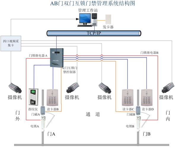 智能卡AB門雙門互鎖門禁是智能門禁系統的一個非常巧妙的應用,在一個需要嚴格控制人員進出區域外的通道上安裝雙門互鎖門禁,當人員通行時,經過第一道門之后必須關好該門才能開啟第二道門,這樣有效的隔離通道內外兩側的空間,防止了犯罪分子尾隨進入安全區域等情況的發生。該雙門互鎖系統還可配合閉路監控設備實現中心對刷卡人員的監控,還可以安裝指紋儀實現更高級的指紋AB門雙門互鎖門禁。