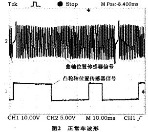 該車故障的診斷,充分利用了雙蹤示波器的雙蹤顯示功能,使曲軸與凸輪軸的波形、轉速關系很清晰的反映出來,使故障的判斷、定位較迅速。