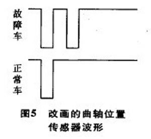 故障總結為什么此車會出現間歇性起動困難的現象?再來看一下圖1與圖2中曲軸位置傳感器的波形,假如在圖1中曲軸位置傳感器波形最上方向下一點的位置畫一橫線,又在圖2中曲軸位置傳感器波形上同樣位置畫一橫線,根據在此線上有無波形可得出圖5中的2個波形,ECU只有得到圖5下圖波形才能發出點火信號起動發動機,而ECU得到圖5上的波形不能發出點火信號起動發動機,但在偶然的時刻故障位置產生的波形恰好達到合格的底線時,就可以起動發動機。起動后,ECU對曲軸位置傳感器波形的檢測就不是那么嚴了,因此,發動機起動后不會熄火。也就是此車故障的根本原因。