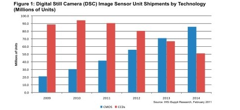 據(jù)IHS iSuppli公司的研究,數(shù)碼相機(jī)CMOS圖像傳感器出貨量未來(lái)三年將快速增長(zhǎng),到2013年將首次超過(guò)CCD。