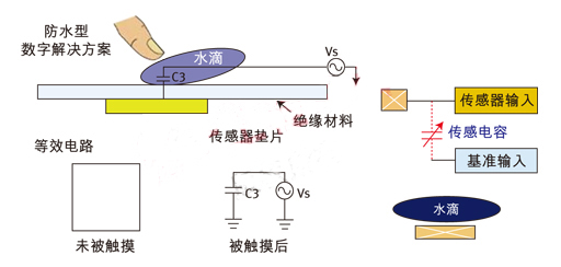 圖2:模擬觸摸方案;由于需使用參考地,可能會受到水滴的影響。