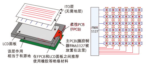 圖5:使用FMA1127實現的觸摸屏及PCB和觸摸屏的疊層安排。利用TDC比較由檢測電容形成RC延時線與基準RC延時線的延時差別。使用差動信號消除或降低了相關/相干噪聲源的影響,無需地層。