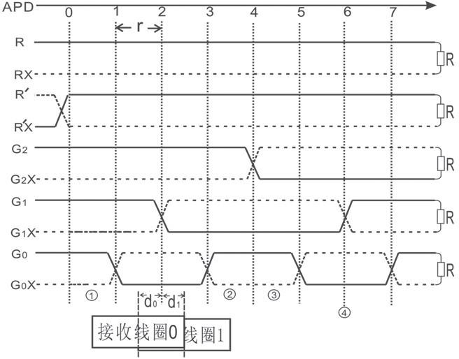 在t0、t1、t2、t3、t4時(shí)間段,分別向傳輸對(duì)線R、R’、G2、G1、G0發(fā)送載波信號(hào),在t5時(shí)間段不發(fā)送。車(chē)上天線箱中有兩個(gè)接收線圈:接收線圈0和接收線圈1。APD檢測(cè)是從接收線圈0感應(yīng)信號(hào)的相位中得到APD位置。在t0時(shí)間段,線圈0感應(yīng)的是R線發(fā)送的信號(hào),稱為R信號(hào);在t1時(shí)間段,線圈0感應(yīng)的是R’信號(hào),R’信號(hào)與R信號(hào)反相,記為=1,作為起始位;在t2時(shí)間段,線圈0感應(yīng)的是G2線發(fā)送的信號(hào),G2=0或1,取決于接收線圈0的位置。若接收線圈0的中線分別在①、②、③、④的位置,則接收線圈0的接收信號(hào)的相位如圖3所示。