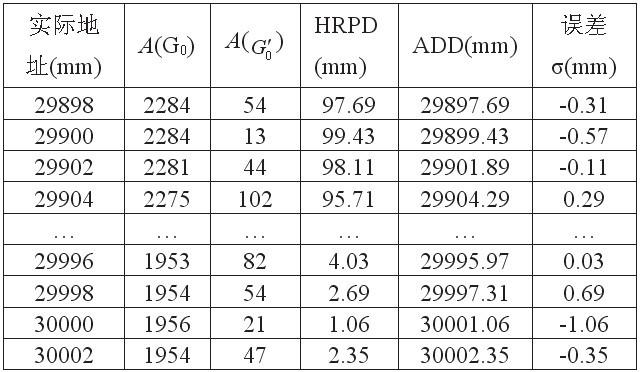 實(shí)驗(yàn)方法:在編碼電纜任找一處反復(fù)移動(dòng)天線箱,直至檢測(cè)到A(G''0)為最小,此時(shí)顯示地址為29.000m,以此處作為實(shí)際的29.000m。然后將天線箱在此附近每隔2mm移動(dòng)一次,記錄每次所檢測(cè)的A(G0)和A(G''0),并根據(jù)檢測(cè)的數(shù)據(jù)計(jì)算出位置數(shù)據(jù):HRPD、ADD。同理,在30.000m處作同樣測(cè)試。部分檢測(cè)數(shù)據(jù)和計(jì)算結(jié)果如表1所示.