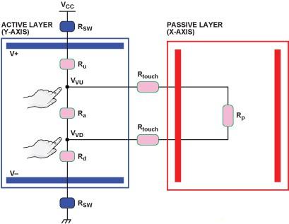 連接直流電壓的層稱為“有源”層,電流與其阻抗成反比。測量電壓的層稱為“無源”層,無相關電流流經該層。發生單點觸摸時,在有源層中形成一個分壓器,無源層電壓測量通過一個模數轉換器讀取與觸摸點和負電極之間的距離成比例的電壓1.