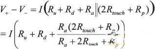 阻性屏幕中的兩點觸摸檢測模型如圖 2 所示。Rtouch為層間的接觸電阻;在現有的大多數屏幕中,其數量級一般與兩層的電阻相同。如果有一個恒定的電流I流經有源層的兩端,則有源層上的電壓為: