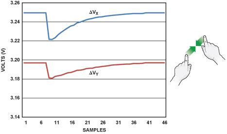 圖 3 顯示了一個沿著垂直(Y)軸捏合的例子。當手勢開始時,其中一層的兩根電極之間的電壓恒定不變,另一層則表現出階躍性降低,然后隨著手指相互靠近而提高。