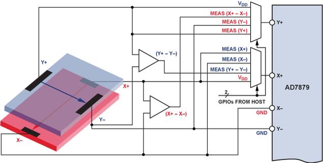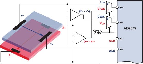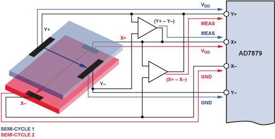 半周期 1:電壓施加于Y層,同時測量(VY+ – VY–)、VX–和 VX+。每完成一個測量,AD7879 就會產生一個中斷,以便處理器改變GPIO配置。