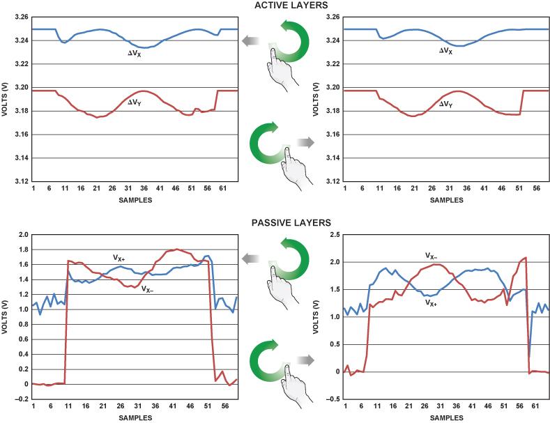 在后半周期中,將一個直流電壓施加于下層(有源層),并測量Y+引腳的電壓(對應于VX+ – VX–),以提供與X方向上的運動(接近還是分開)相關的信息。