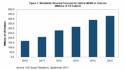據(jù)IHS公司的最新MEMS市場(chǎng)研究報(bào)告,由于市場(chǎng)對(duì)寬帶互聯(lián)網(wǎng)服務(wù)的需求持續(xù)激增,預(yù)計(jì)2011年以及隨后幾年光MEMS銷售額強(qiáng)勁增長。光MEMS是超高速光纖網(wǎng)絡(luò)中的關(guān)鍵部件。